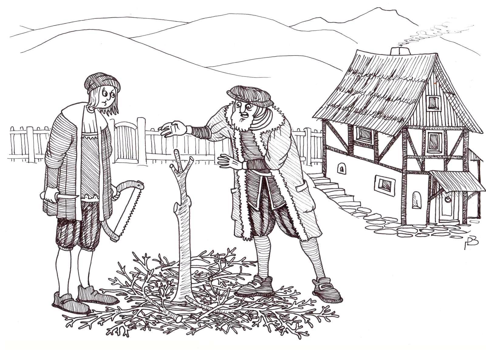 „Můžeš mi říci, kde mají těm stromům vyrůst jablka, když jsi z nich udělal takovéhle pahýly?“ stýskal si starý muž.